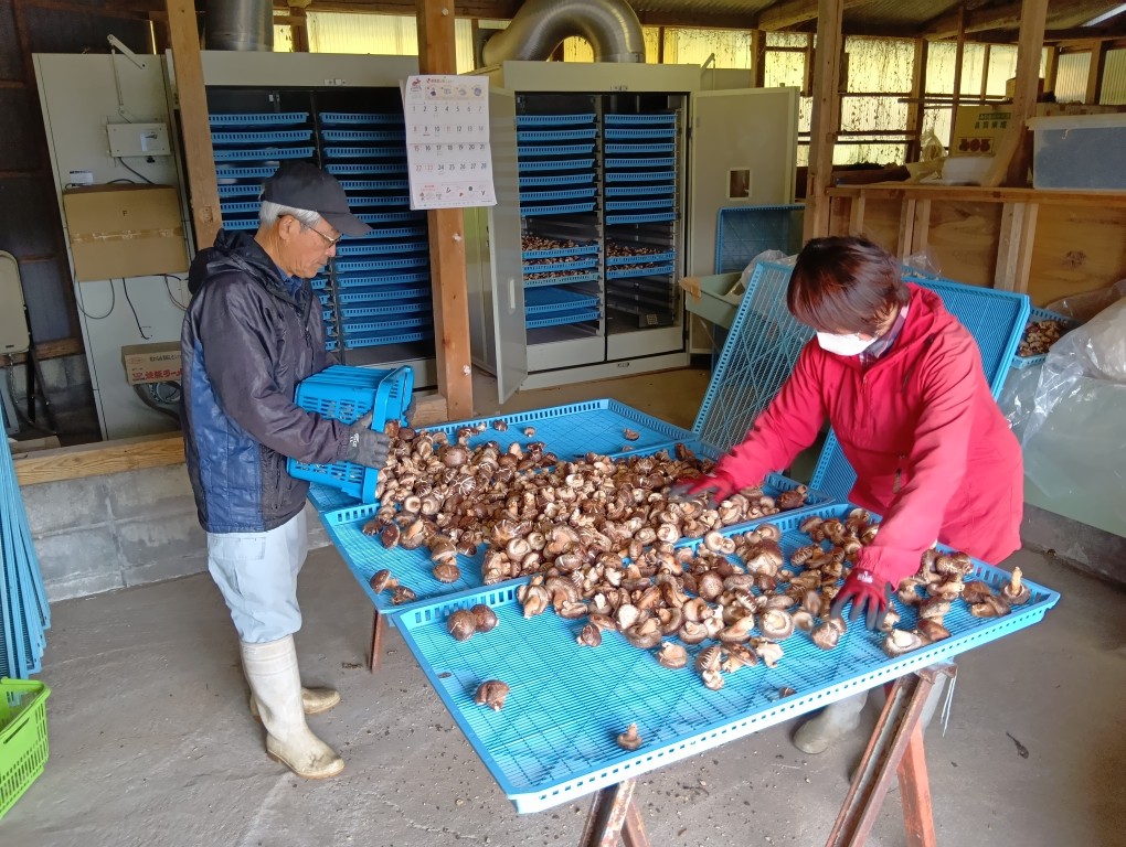 収穫したシイタケを一枚一枚手作業でエビラに並べ、乾燥機へ🍃